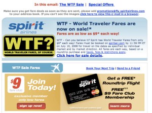 The other day I noticed this ad and laughed. Either the creative knew exactly what he/she was doing or the are seriously out of touch with the world. WTF has long been shortcut for a well know phrase. Daring creatives and their advertisers, especially ones targeting the YAM audience, can get away with this and many do (e.g. Axe, McDonald’s, Old Spice, etc.) But the Spirit ad, marks the first I’ve seen in the typically conservative airline world. Granted, World Traveler Fares isn’t a stretch to but is this Crazy? Or crazy like a fox?